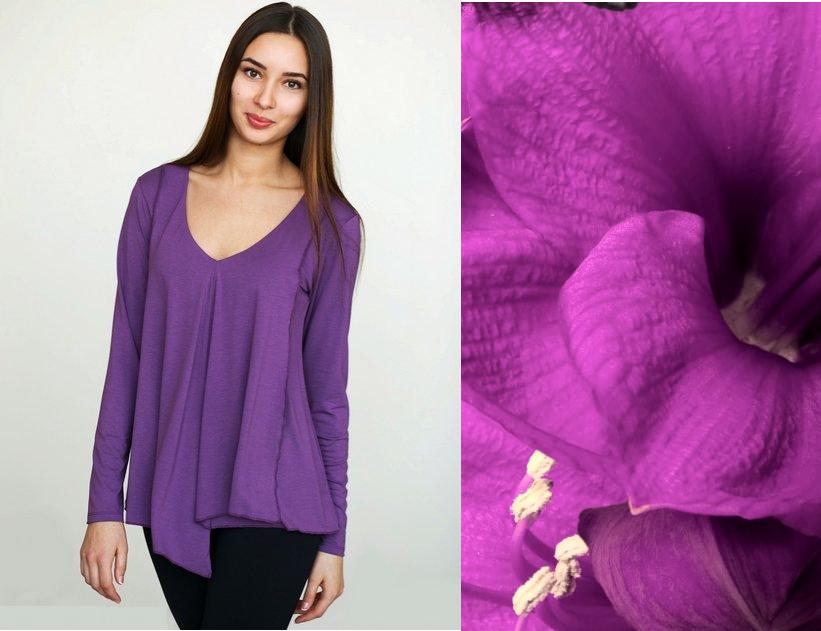 Яркая блуза оригинального покроя с длинными рукавами. Выполнена из мягкого экологичного вискозного трикотажа с эластичными добавками. "Разлетающиеся" детали фасона смотрятся женственно.