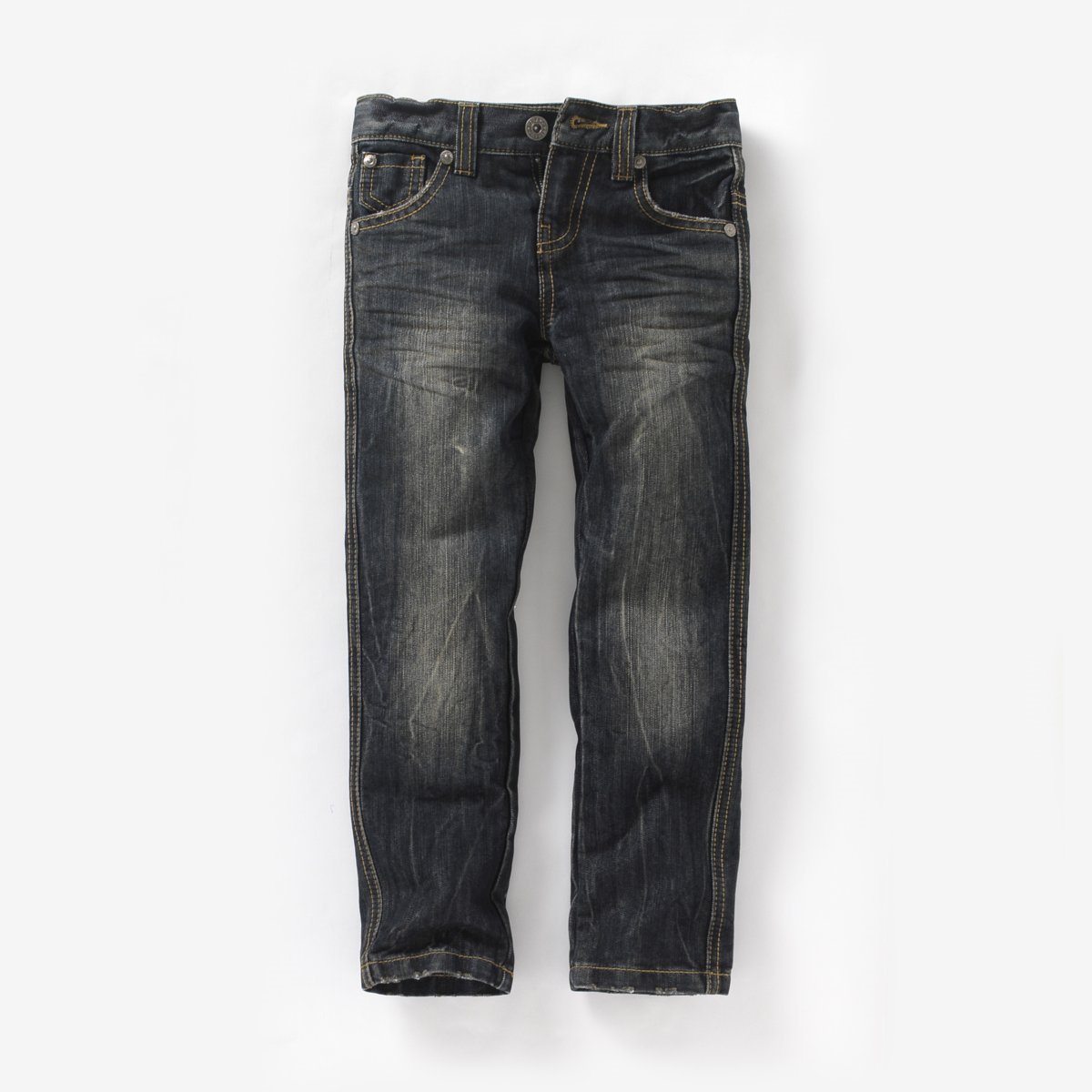 Джинсы из денима, 55 % хлопка, 45 % полиэстера. Пояс со шлевками для ремня регулируется внутренней резинкой на пуговице. Застежка на молнию и пуговицу. 2 передних кармана + 1 часовой карман. 2 кармана с вышивкой сзади. Заложенные складки и линялый эффект спереди и сзади.