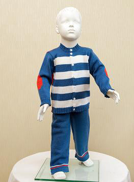 комплект вязанный из хлопка, кофта и штанишки. Кофта на пуговицах, с воротником-стойкой, спереди широкая белая полоска, спинка красная, на локтях красные налокотники, горловина, манжеты и низ изделия выполнены специальной вязкой, что позволяет хорошо тянуться и при этом сохранять форму. Штанишки прямые, с мягкой резинкой в поясе, по низу две полоски. Очень приятный на ощупь костюм на прохладную погоду.